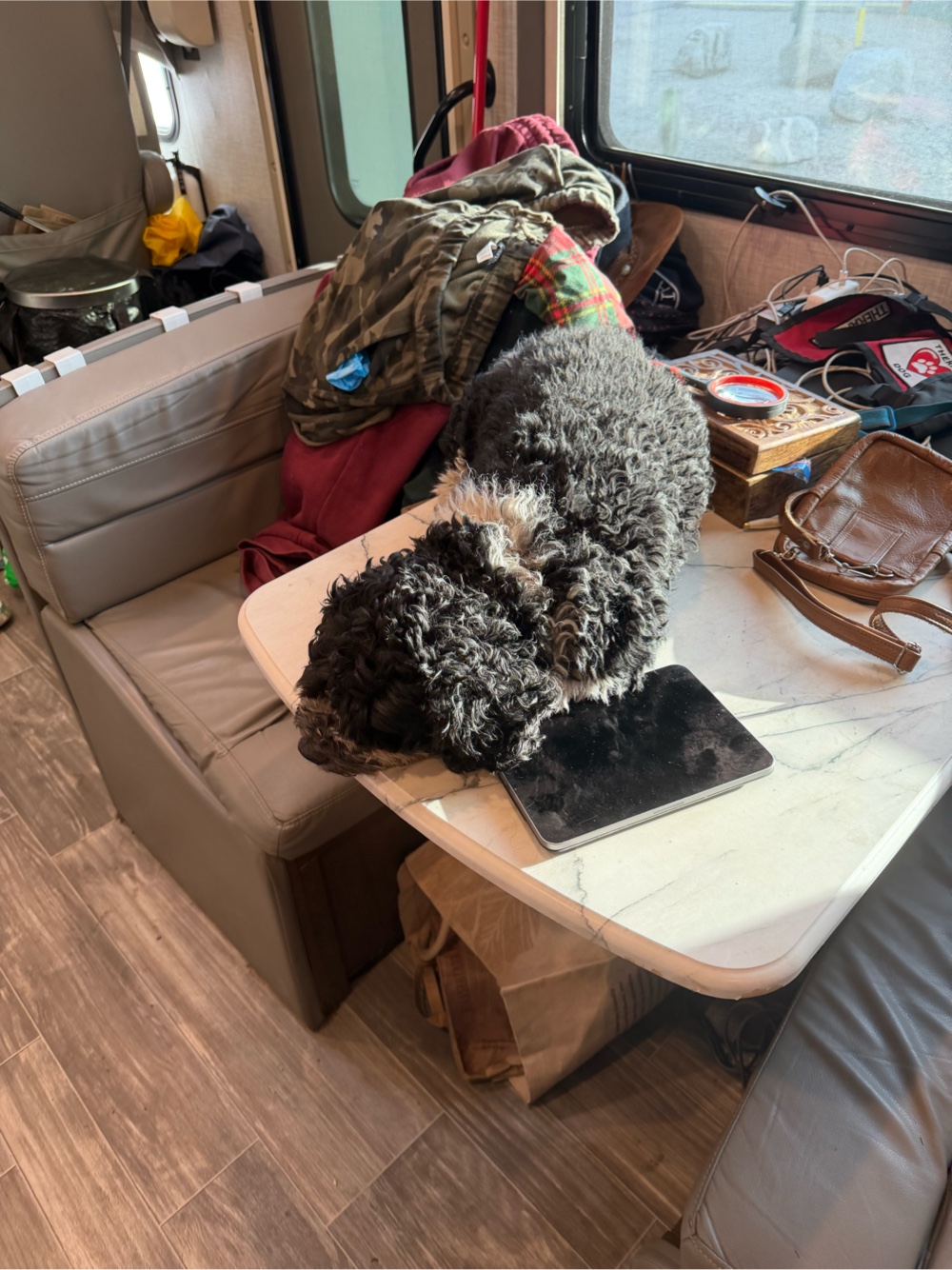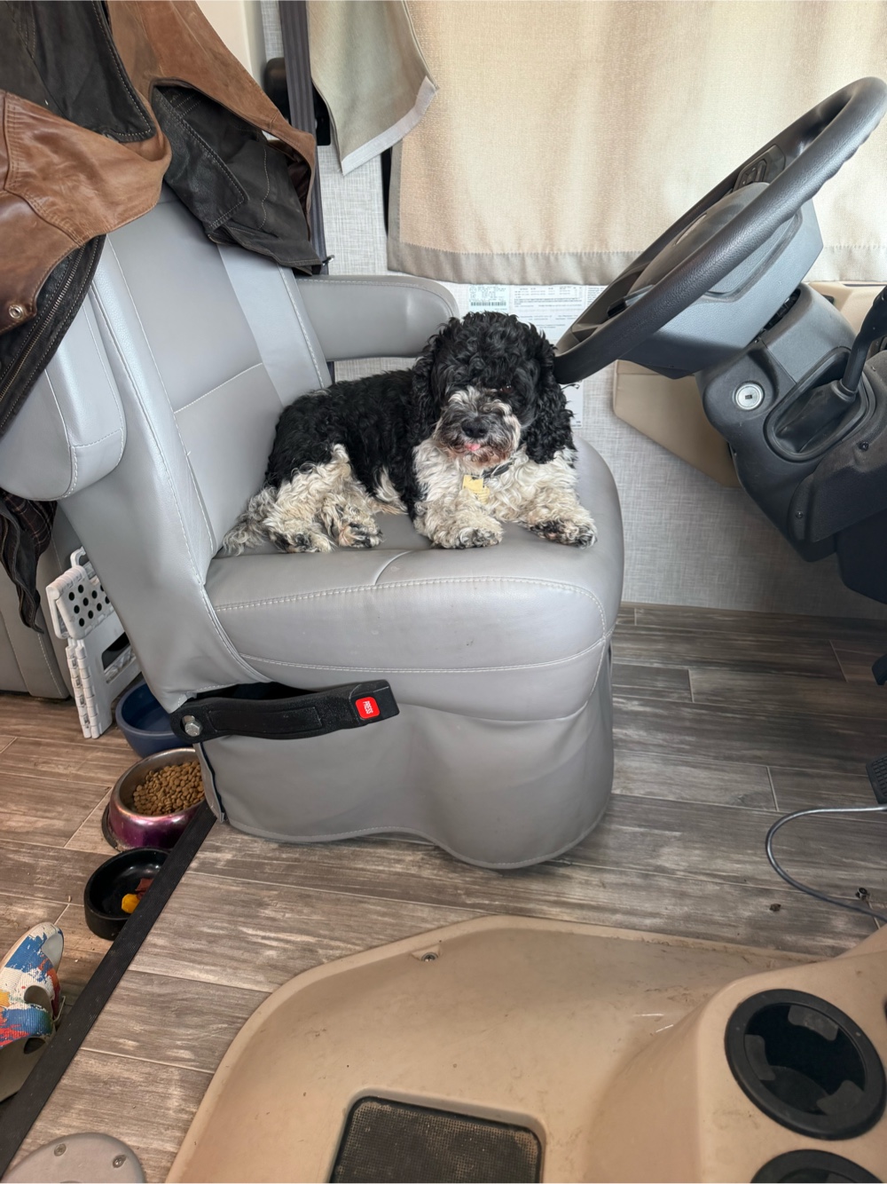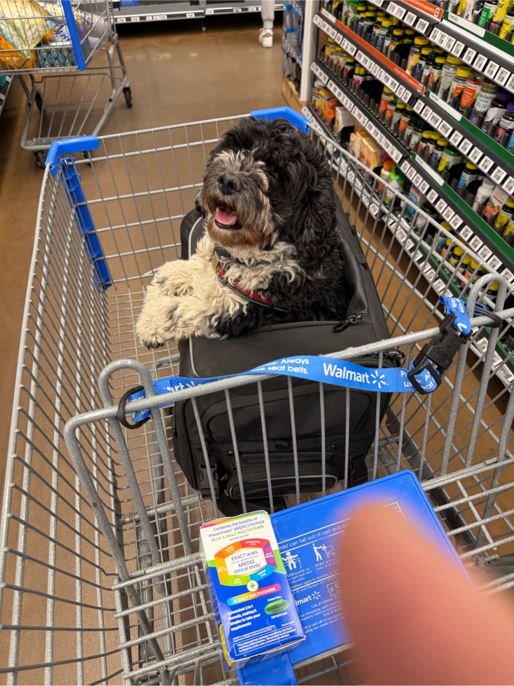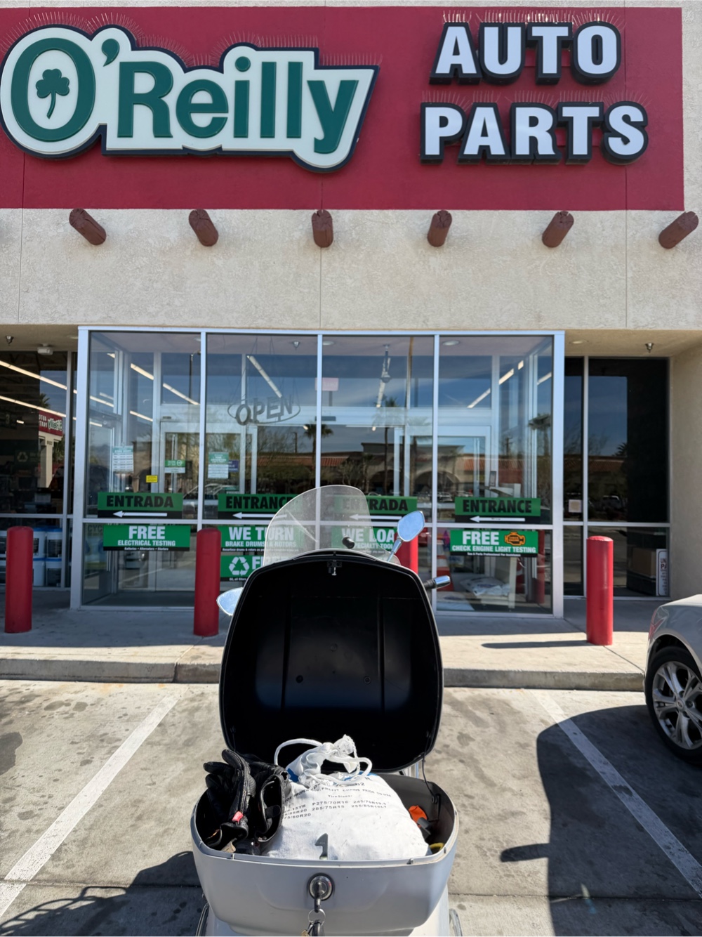 In the afternoon I put Madigan’s box on the Vespa and headed out sightseeing. There are nearby markets but about 10 mile away was the Walmart and Costco I found. I need the AREDS 2 formula eye vitamins and was glad to find these. I don’t need more food. My fridge and cupboards are full but I went hungry as a student and during divorces so guess I have a trauma response. Alternatively I could just be a fatty. Anyway I picked up port chops, steaks and half and half for the coffee. Then once I’d checked out I had to figure out how to load it all on the Vespa with Madigan. I look forward one day towing a little truck like the maverick. I did 10 minutes on the 70 mph freeway on the VESPa FOT 120 km. With cross winds I thought I really would like 4 wheels. Yet when I got off the freeway I was again sure God loved me and Madigan. Meditation and prayer in motion and 2 wheels high speed mass traffic certainly focuses the attention especially if you’re carrying a little fuzz ball you adore. He loves the ride and I see him in the mirror smiling behind me. Biker Dog.