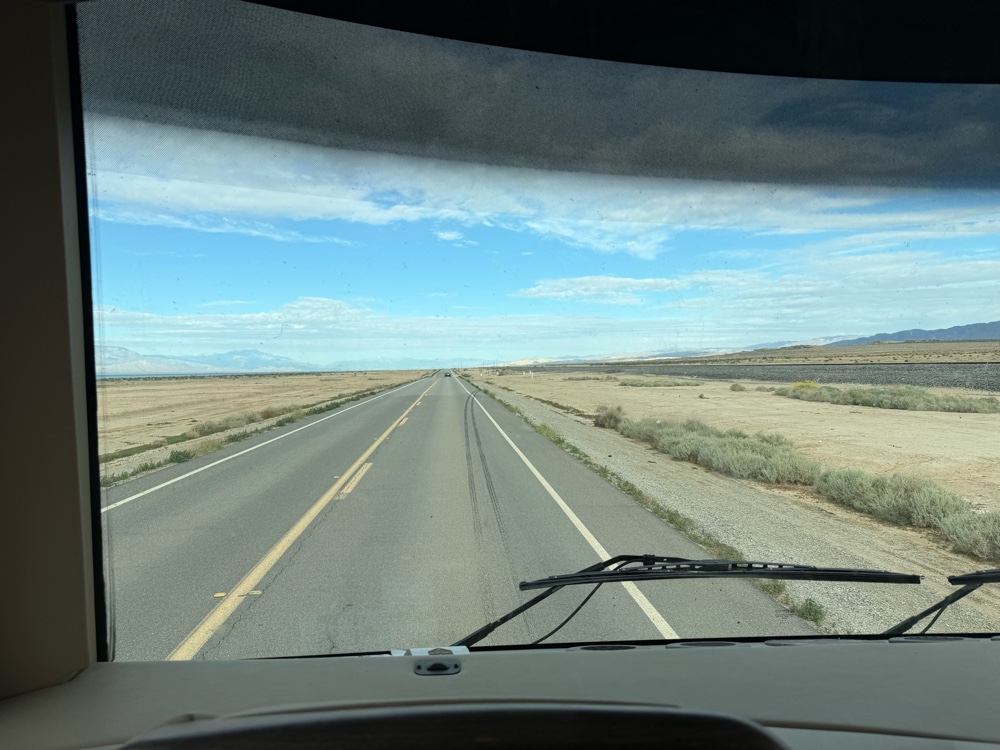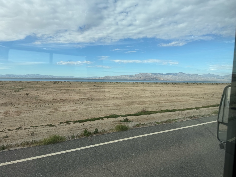 Leaving FOY the drive was stupendous. Great view of the Salton Sea and sandy mountains. Incredible vista with the class A window. I have my iPhone 17 with the Apple Watch so not only do I see the blown up version of the map on my navigation screen my watch gives me tactile cues telling me to turn as the map flashes. It was a sun blue sky whisps of white cloud day. 75 to 80 degrees
