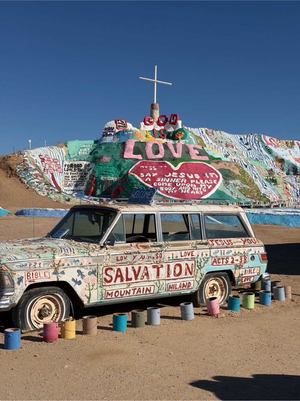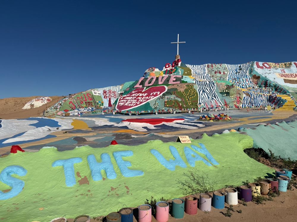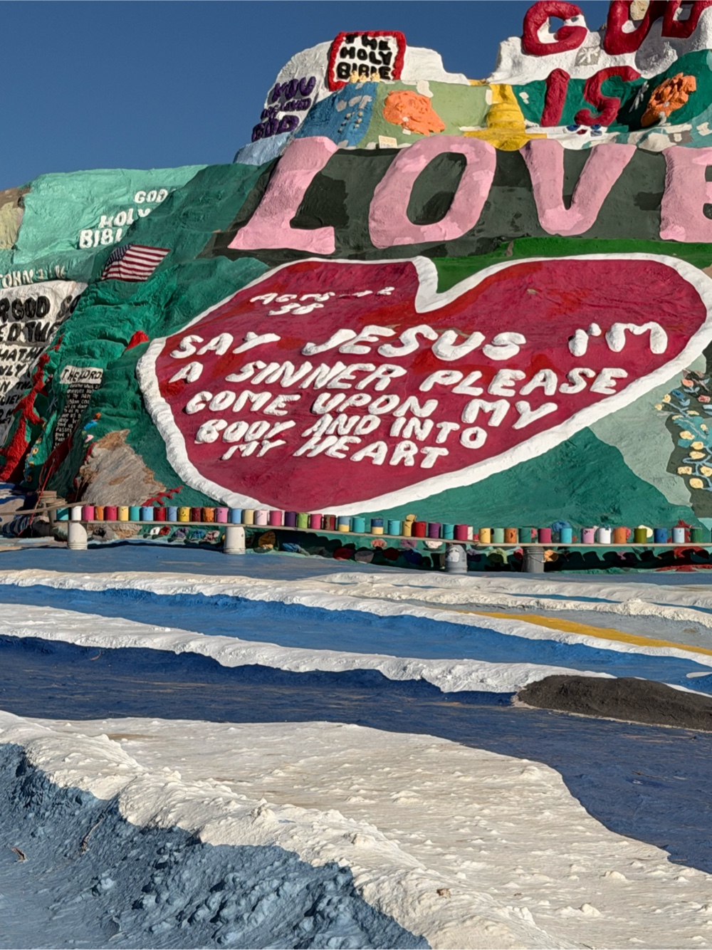 Seeing a hot air balloon, he decided that was the way to have people see the Sinner’s Prayer. Working odd jobs and with a second hand sewing machine he attempted to make a Hot Air Balloon with “God is Love.”  In 1984 he moved to Niland Southern California with his home built inflating furnace. He never got his balloon aloft. It kept ripping so after 14 years he admitted defeat with the balloon and proceeded to make his first mountain monument with cement and paint.  When this collapsed he made a second mountain with adobe cement and straw . People donated paint and Leonard figured he’d used 100,000 gallons on his mountain