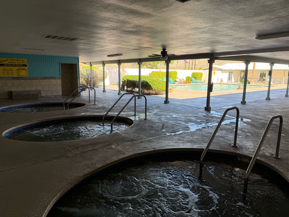 This KOA Holiday has a lot of amenities, best the pool and natural mineral hot springs . They have several dog parks too. I immediately took Madigan for a walk around the park. He had his poop and liked the little dog park. There’s a really big one for big dogs. You could exercise horses in there. Once he was walked I put on my swim trunks and headed for the pool. Three hot tubs of different heat 100 degrees to 104 degrees. . They weren’t as hot as FOY’s Lobster Pot or tubs but they were hot and the jets were perfect. I’ve had a couple of days of these ‘waters’ and my back really is feeling better. I suspect it’s the soothing waters and the positioning of the jets.