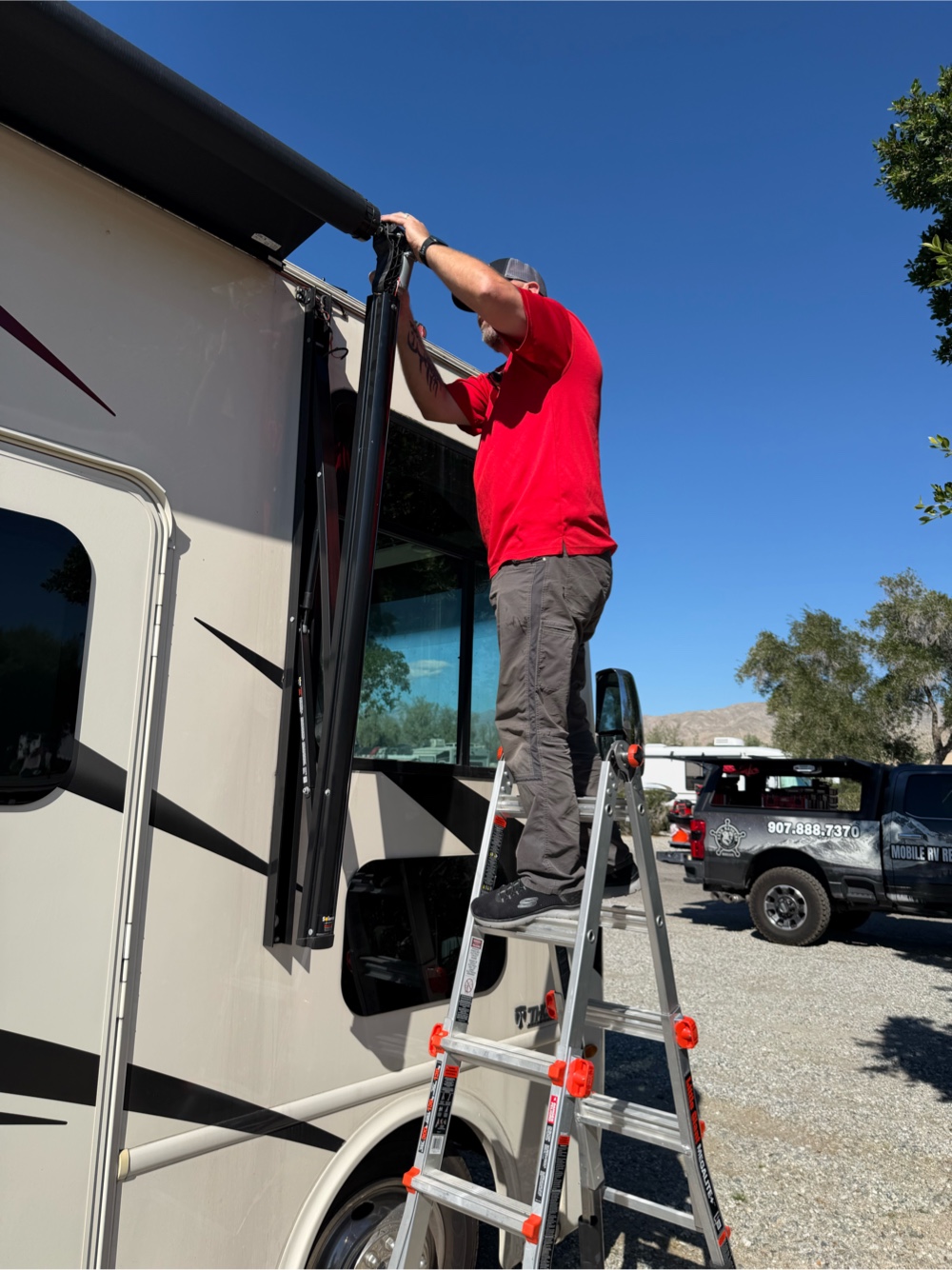 I saw an (RV repair guy FreedomAdrillRVTech.com -9078887370) on the way to my spot and asked him if he’d repair my awning. Turned out to be the best guy. I ‘d broken a wire on the awning which I think was a low hanging tree outside the market. I’m learning. I’d thought it was a fuse but not. The awning is important here as I have the sun shining directly on that side and it really does heat up. The awning helps keep my motorcoach cool. The A/C is a god send. My little fur bear dog loves me for the A/C.