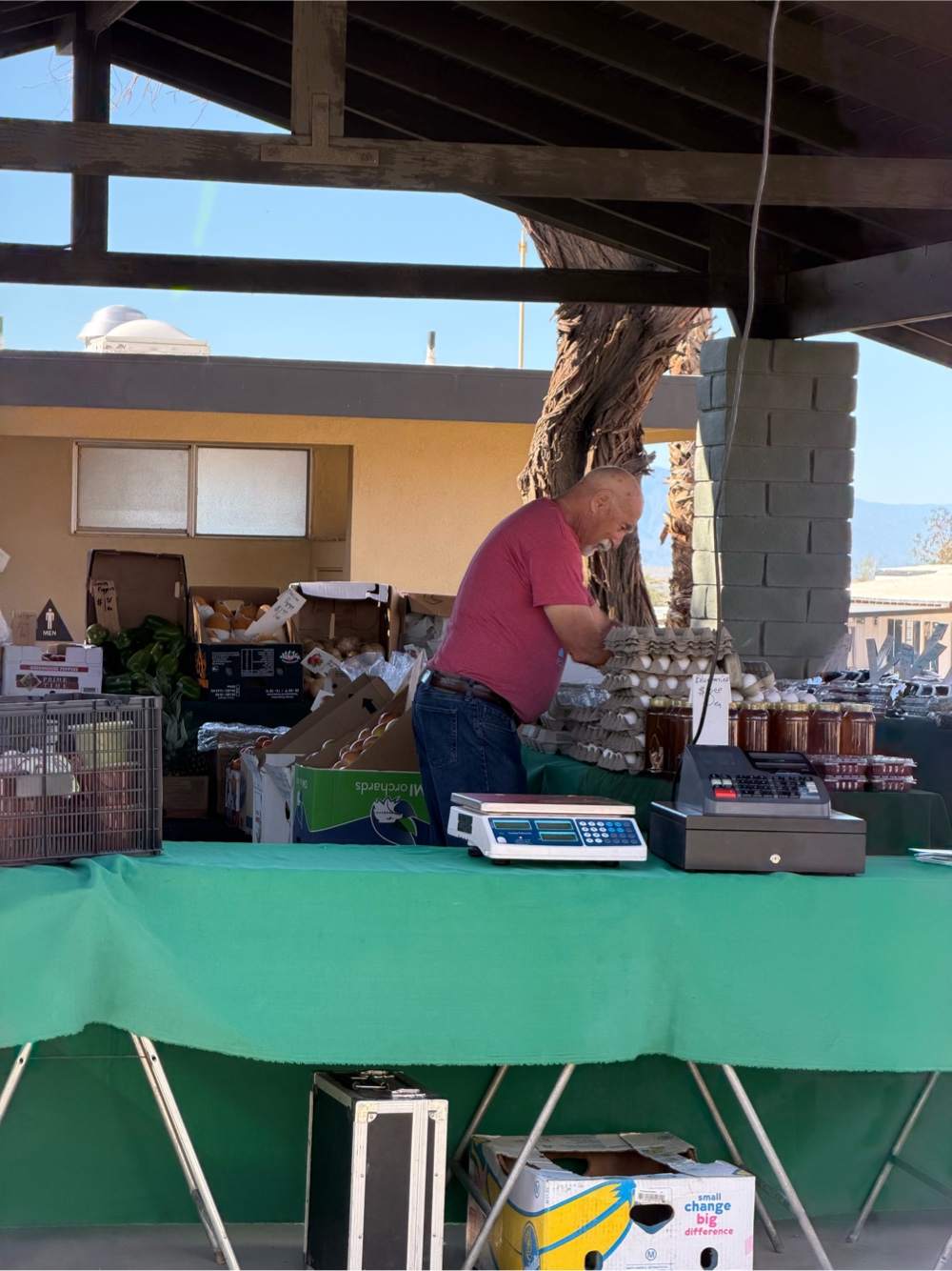 I like the palm trees.  Great blue sky today and  desert winds.  More people have come into the court yard.  People say hello to each other. There’s community.  It’s easier to understand a place if there’s a factory. I imagine there are retired folk here. I’ve seen some vets. The Vietnam Vet Ball Cap gave one away.  Soon the Gulf War folks will be following.   I’ve not seen children in town but they are out on the breach. Families atop to look at the weird modern and contemporary art installation art which would be a sensation at the LACMA or Getty.