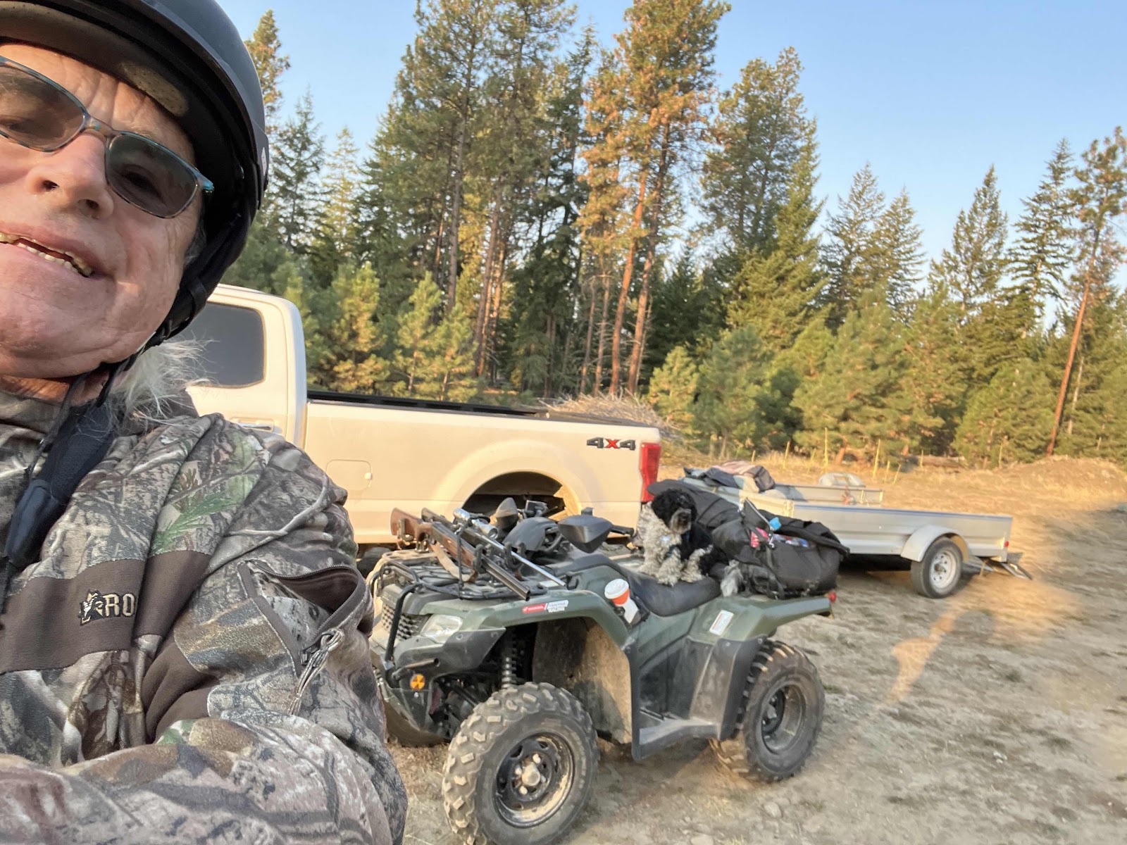 I was up at 6 to be at the A&W for 7. I learned later it opened at 6 am so was earlier the next couple of days. I had planned to go out Henly where I’ve shot a lot of grouse in past years. When I took a cabin for Laura at the Princeton Castles or left the camper there this was my favourite hunting road. The sun was well up when I unloaded the ATV fro the trailer and then loaded all the gear on . I have a short leash that clasps onto Madigan’s harness as he sits behind me. A couple of times he’s fallen off his seat into the foot well but the leash keeps him above the road, Each time I just lifted him back up with the harness. I could tell he was thankful. He then for a while tried not to lean out toofar to peer around me.