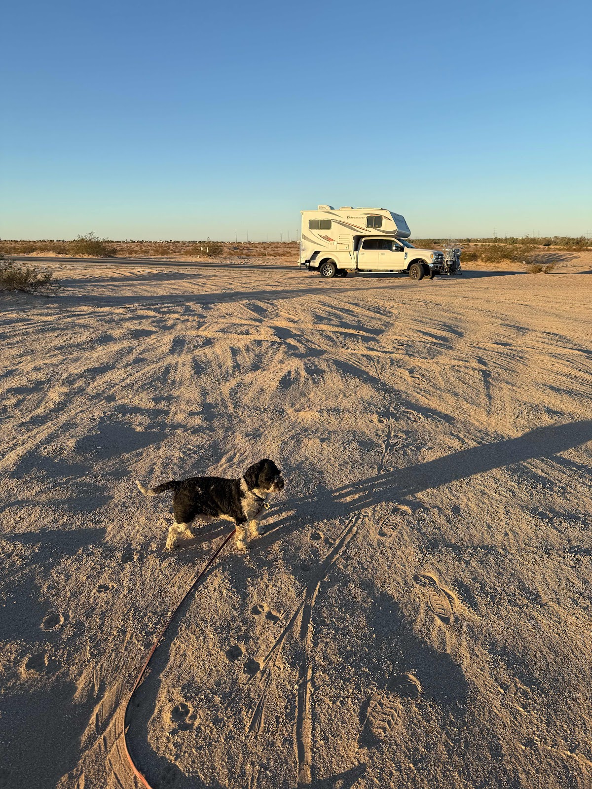 I’ll have to walk him again. He pooped in the office and I had to clean it up checking in. I felt so badly. He’d not had a walk of any merit so it was my fault. He walked for an hour or two with me crossing the border and such. He’s tuckered out whereas when we camped at night I didn’t walked him concerned about traffic and night and dependent on flash light. I’d then focused on fixing the lock and until that was done I wasn’t able to leave the camper . He’s such a good boy and no harm done as I cleaned it up with Clorox towels, Poor guy. The woes of travel as a dog.