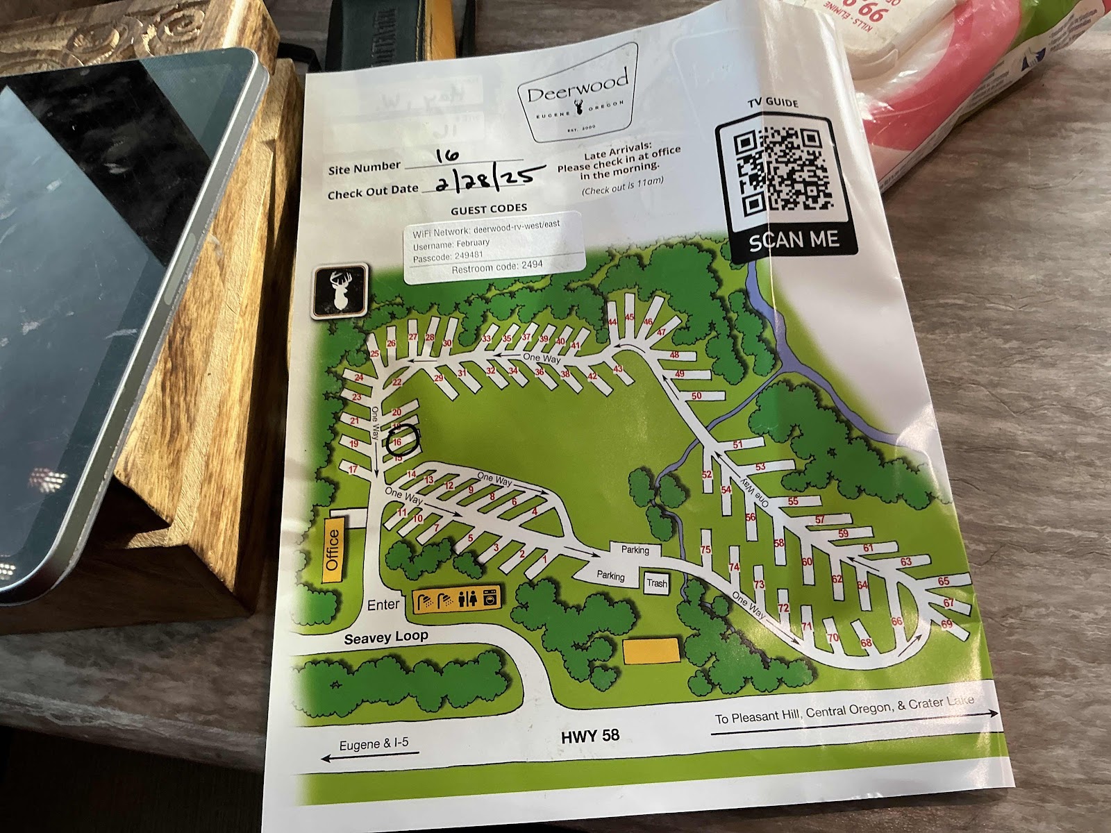 The office was extremely welcoming. I set up , let Madigan out for a pee and even unloaded my Vespa. That was good and bad. When I arrive I know I should settle in and not go out right away but I did with the Vespa. I rode into Springfield with the decline light bought some chicken and fries then headed back getting lost. I missed the freeway turn and did 20 km on the freeway in he dark at 70 mph to get back to my place. A sheriff asked if I needed help as I looked up the RV park on my iPhone gps maps realizing I’d gone past it. I didn’t like when a Big Rig honked at me as I’d slowed to 60 mph to make sure I didn’t miss the turn off this time round. Thankfully I arrived home safely and truly thanked God for getting me here.