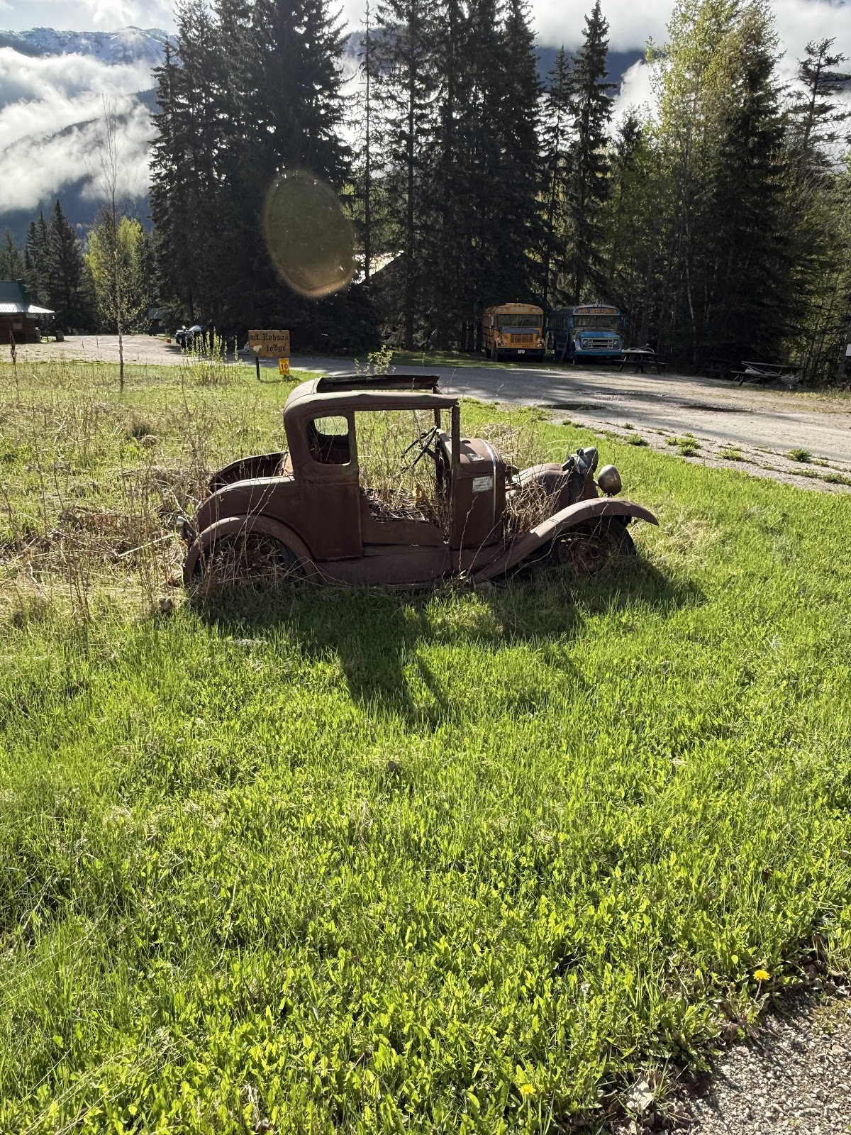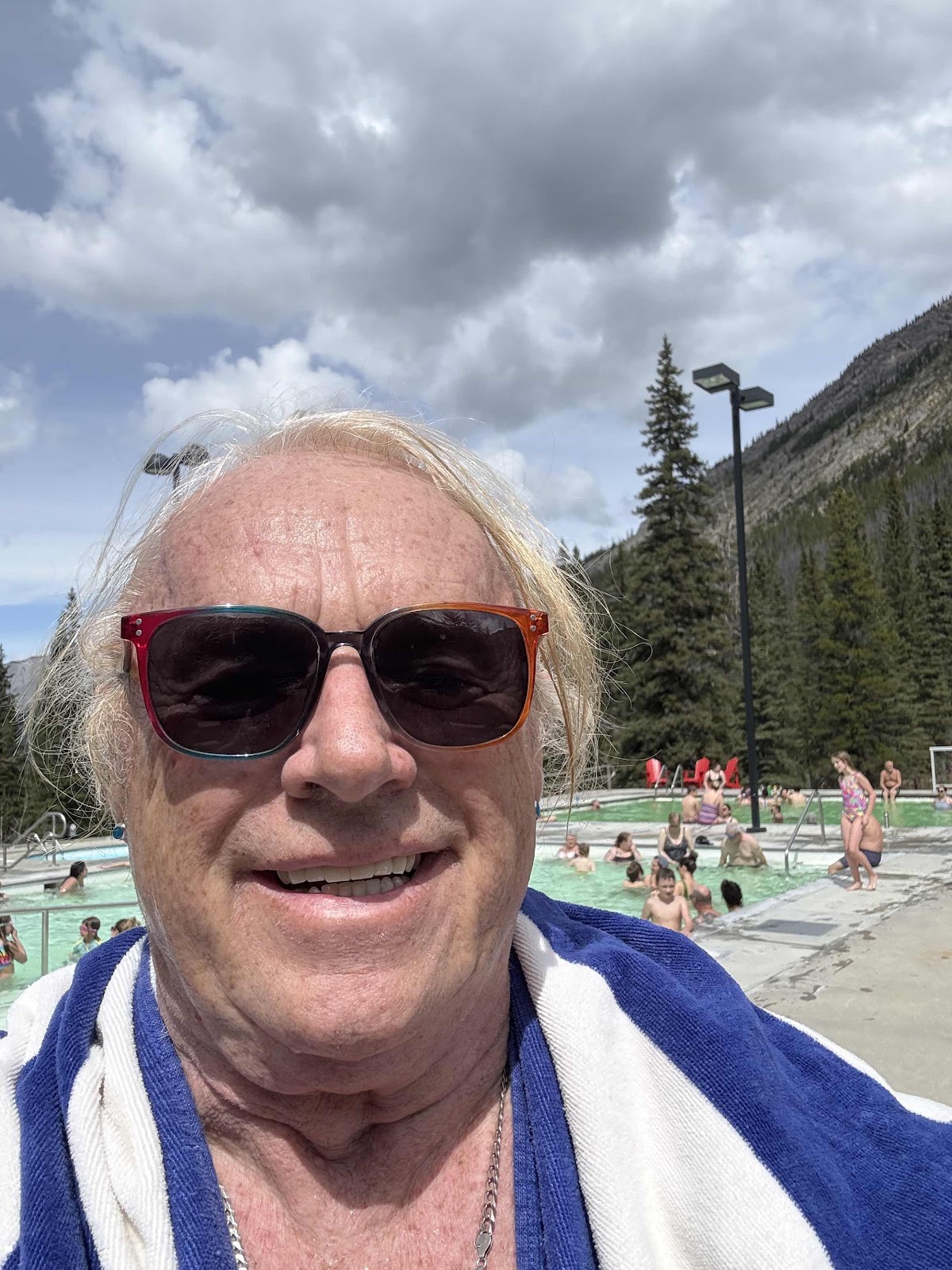 Driving out of Jasper I came the road to Miete Hot Springs. I couldn’t resist. What a great hot springs and spa!!! 17 km easy drive on a paved road through the woods to the spa. There are cabins there and big pools. Great to be in a hot springs in the sun, snow capped mountains around, blue sky, sunshine. Attractive life guards. Young and old. A wonderful soak. I enjoyed the black one piece bathing suit. Madigan waited in the camper and was glad to see me on my return.