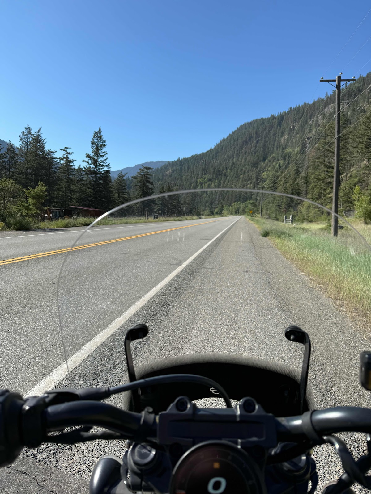 He seemed to wonder at me riding the Harley or taking this off road route to Spokane. When he gave back my passport he handed me my Nexus card. It had somehow been stuck in the passport and I thought I’d lost it. Good find, Good news. New terrain now, very sagebrush and cowboy movie. Louis L’amour would like it. I loved riding the Harley on to Oroville then down the 97. There were stretches of orchard mixed up with free range. All beautiful country. Great riding. Lots of rivers and lakes. I stopped in Oman for gas and to get my bearings. It as getting hotter and hotter when I stopped and downed yellow edition Red Bull. The chocolate bars I bought became liquid in their wrappers in my saddle bag.
