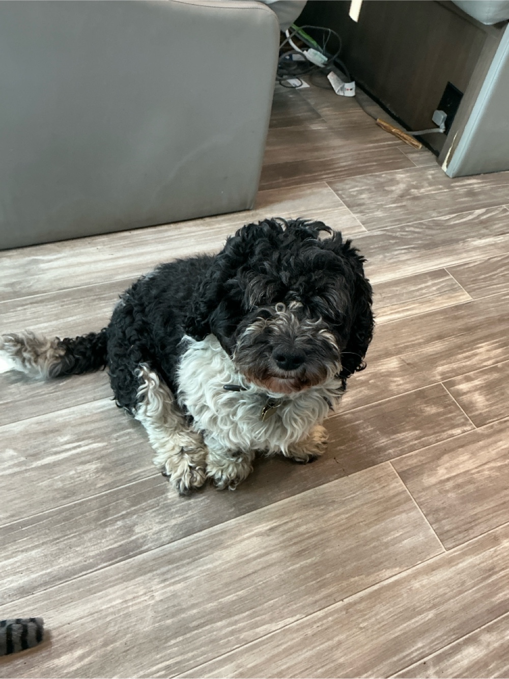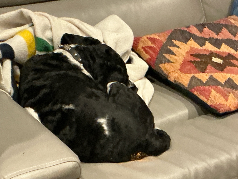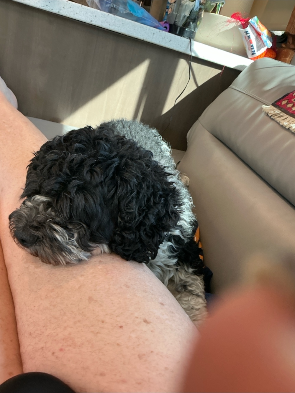 Madigan is 5. He’s a cockapoo and a rascal. A covid dog. He wasn’t socialized the first year and became dependent on me. If I’d had two dogs he’d be more notionally balanced but I’m his one and only. He’s neurotic. Then he had a bad experience with a groomer and became even more anxious. But he tries not to let on that he’s not a big and tough boy. He piddles at the door when I leave him alone, still. He barks and cowers in the corner protecting the place. I’ve had a camera and watched him be anxious with strangers outside whereas other times he just sleeps while I away. Laura is his Mommy and he’s quite incestuous. His humping has thankfully reduced but for a while there her leg was his fetish and it was all we could do to stop that. He’s had his ways with pillows too. That’s less this year. Cockapoo’s mature between 3 and 5 going from crazy adolescent nut bars to loving statesmen. He’s there. Laura says he watches the door when I’m gone and runs to it when he hears my returning motorcycle. He loves pets and treats and toys ., He also invents little games for himself and us. There’s chasing his tail and staring at me but then he has this thing where he touches each of my feet with his nose when I’m trying to do exercises. You’d almost think it was a blessing or a coach indicating which foot to move.