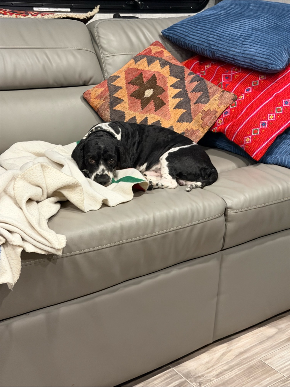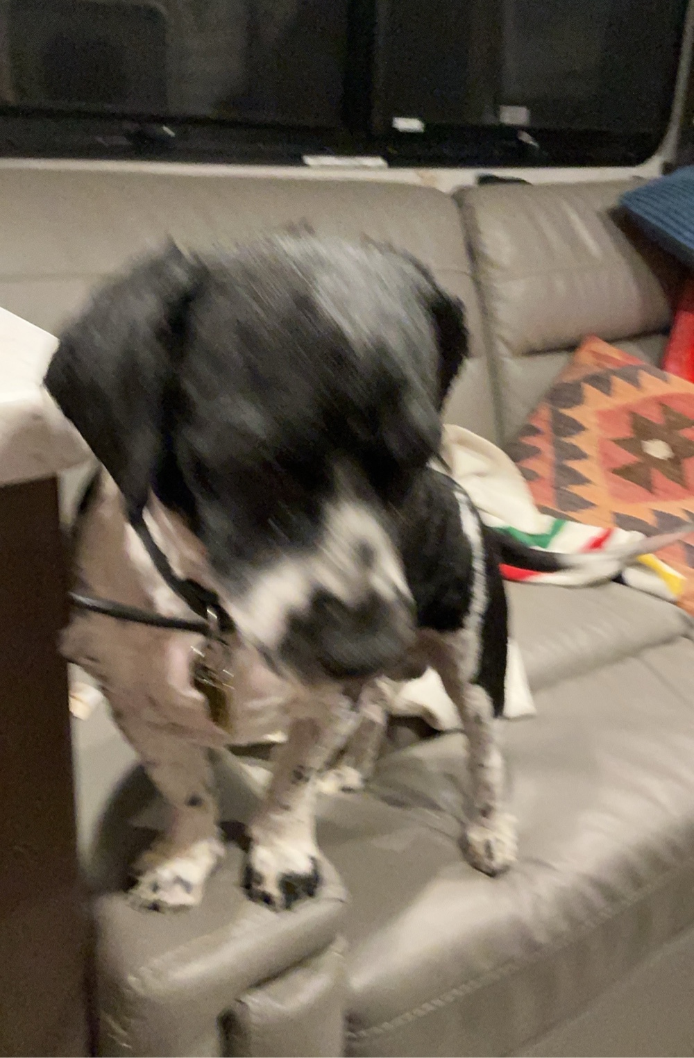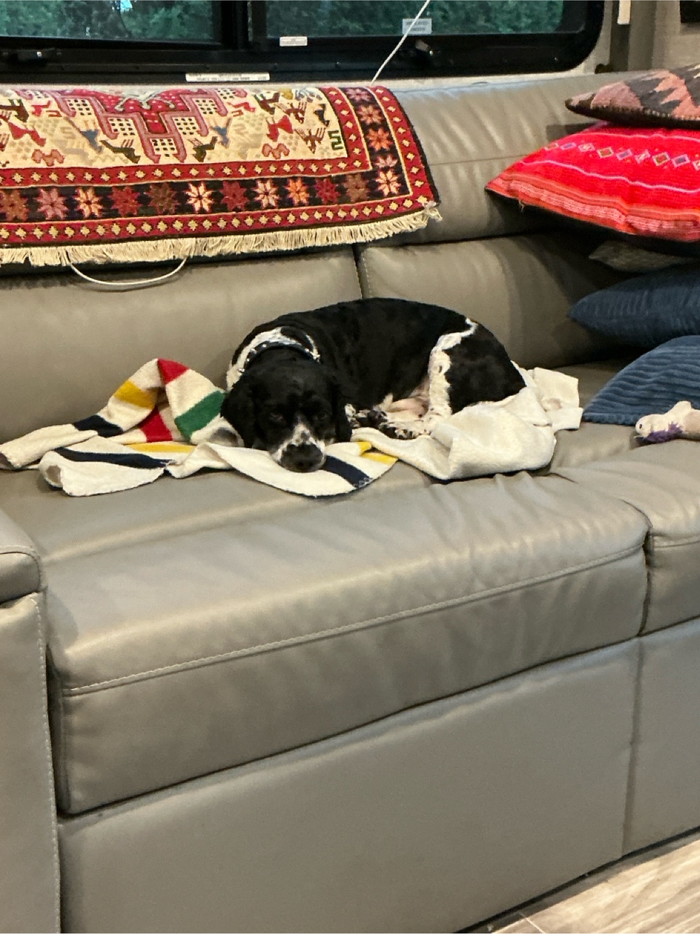 Madigan is 5. He’s a cockapoo and a rascal. A covid dog. He wasn’t socialized the first year and became dependent on me. If I’d had two dogs he’d be more notionally balanced but I’m his one and only. He’s neurotic. Then he had a bad experience with a groomer and became even more anxious. But he tries not to let on that he’s not a big and tough boy. He piddles at the door when I leave him alone, still. He barks and cowers in the corner protecting the place. I’ve had a camera and watched him be anxious with strangers outside whereas other times he just sleeps while I away. Laura is his Mommy and he’s quite incestuous. His humping has thankfully reduced but for a while there her leg was his fetish and it was all we could do to stop that. He’s had his ways with pillows too. That’s less this year. Cockapoo’s mature between 3 and 5 going from crazy adolescent nut bars to loving statesmen. He’s there. Laura says he watches the door when I’m gone and runs to it when he hears my returning motorcycle. He loves pets and treats and toys ., He also invents little games for himself and us. There’s chasing his tail and staring at me but then he has this thing where he touches each of my feet with his nose when I’m trying to do exercises. You’d almost think it was a blessing or a coach indicating which foot to move.