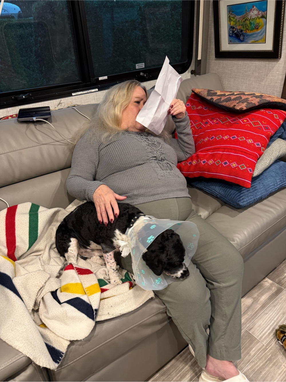 It really was relaxing having Laura for the weekend. She was so kind to Madigan and consoled him and petted him. He loves her and loved the attention, Both of us gave him treats. It rained heavy but we got out for walks together when the rain let up.