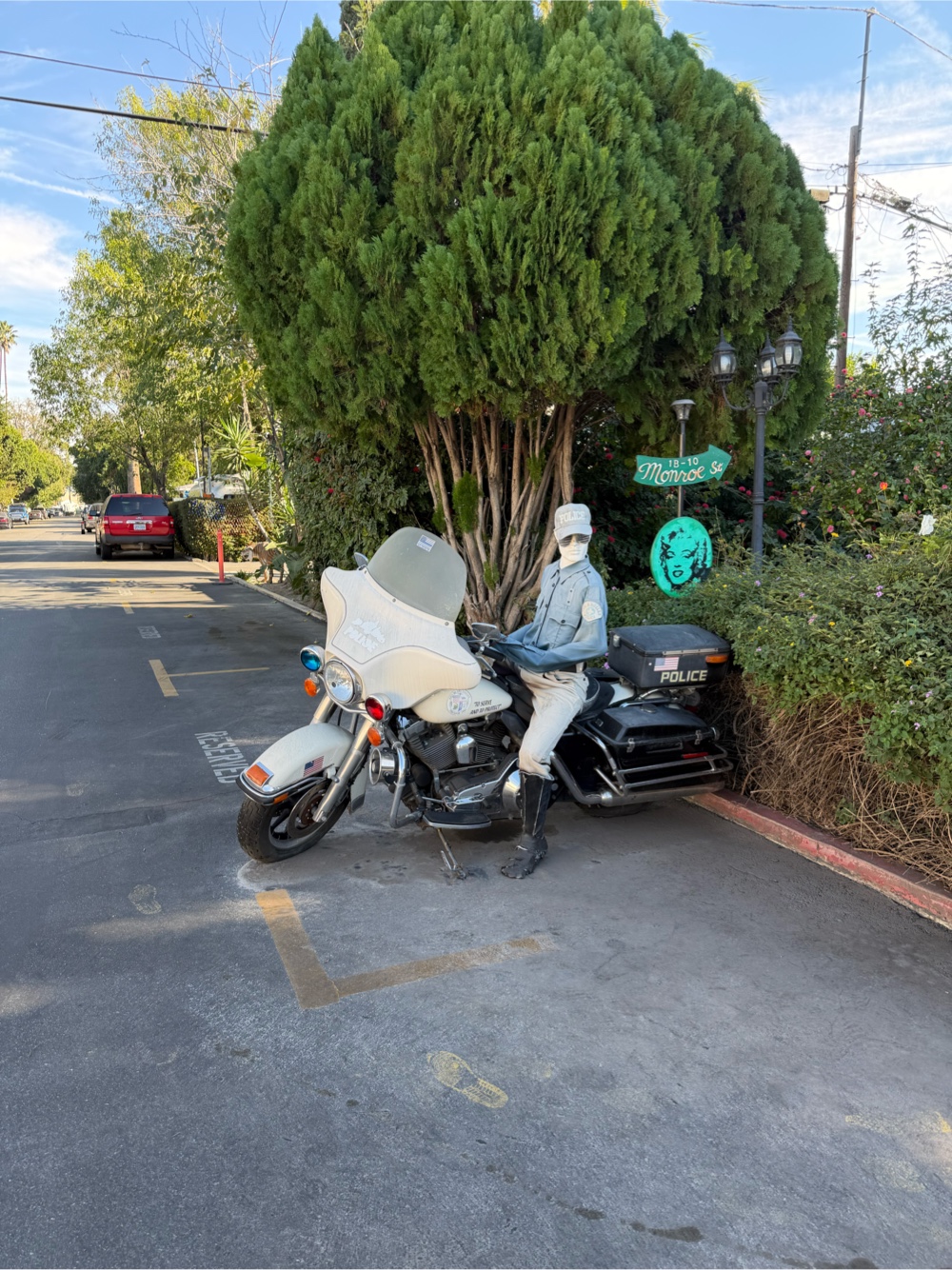 The place is incredible camp. Reminds me of the fellow I knew who did his condo in western Pee Wee with all the kitch accouterments. Here they have the signs like Rodo Drive, Sunset Blvd, Route 66, pink flamingos, and antique police cars, mannequins talking in red British phone booths. It’s incredible. Creative. Alive. Hollywood.