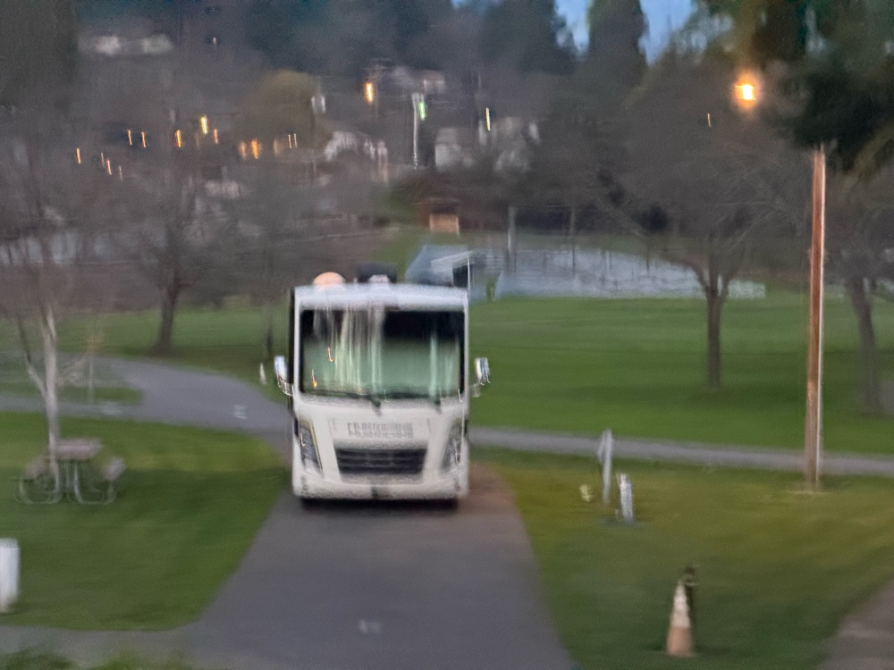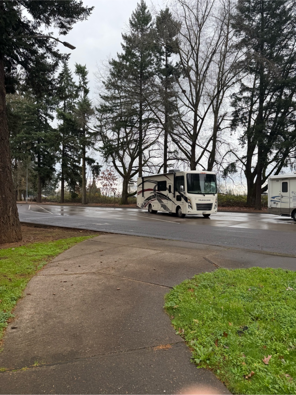 Now I’m hear in Myrtle Creek. I’d never have found it on my own and so glad that Peter told me of the stop. It’s an hour from the “a bit scarey” Grant’s Pass. There had been weather warnings for flooding ent tthe route to day but nothing came of it. Grant’s Pass has had freezing and snow and I took the coast when I came through after Christmas to avoid this. Tomorrow I’ll be glad to put it behind me. It’s challenging but I’ve done it a couple of times and just feel cautious . It’s not something I ‘d like to do in bad weather. I’ll be glad to do it in the morning when I’m fresh. I think Porter and Larry think of things like that so picked this place though there are more RV sites closer to the pass and back along the way in Eugene. This is just right in a way.