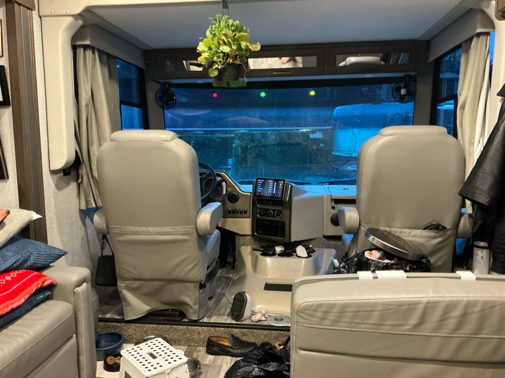 It took goop and screw driver and a hammer to get it mechanically back in place so I could be legal. The screws were bent and I just duct taped the wiring together but actually had it mounted and could drive away. I was hardly underway leaving the border crossing behind when the propane alarm started screaming. I pulled off the I5 to find an RV park where I could wait for a mobile repair or at least find where the closest one was. The mirror kept turning until I found the screw that tightened held i t in place. The alarm let up off the high way and then I was in country roads. The view of the ocean from Birch Bay with my big Class A motorhome window was splendid. I’d sailed down that way. 5 nots an hour while now I was in this great land barge going 60 miles an hour with all sorts of noises and alarms and challenges. I love the iPhone that interfaces with the iPad Pro size monitor allowing me to see and plot my route.