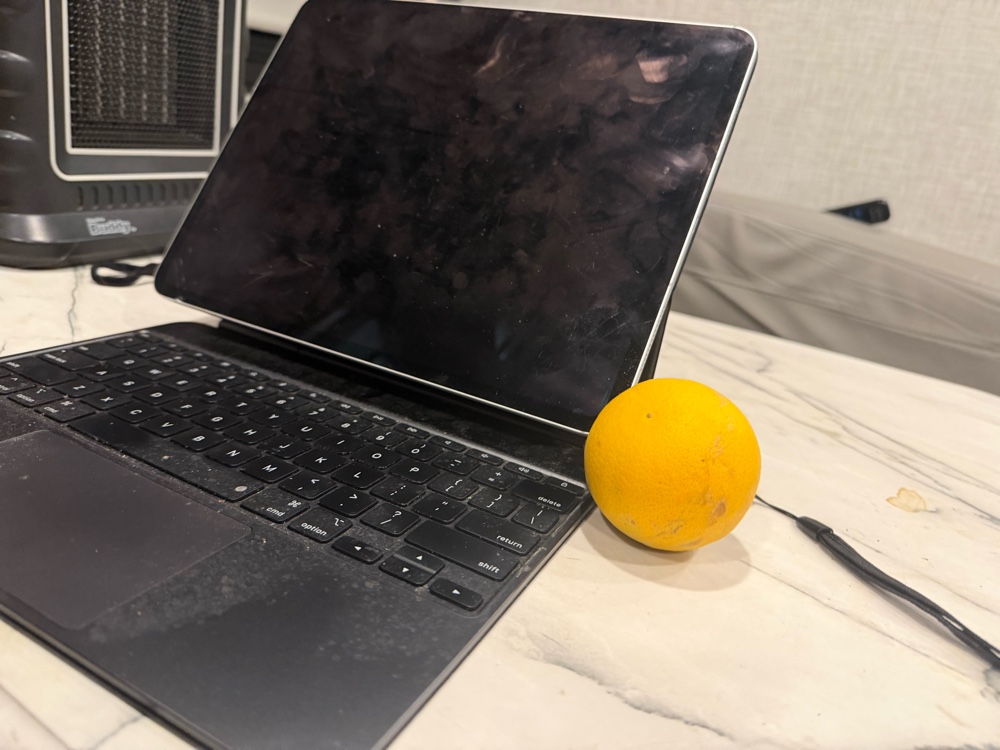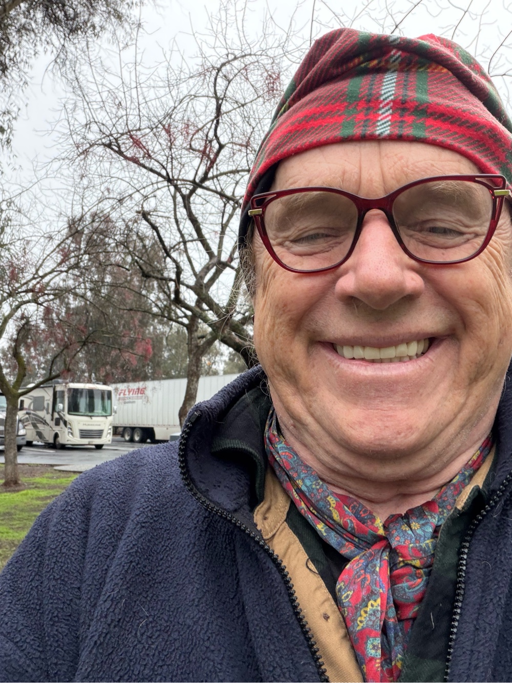 This morning I can see that the RV Park is in an agricultural area with orange trees as far as the eye can see besides us. I had a delicious organge last night taken from the ground beside the tree I’ve parked beside. It’s lovely this morning. Madigan already pooped on his walk.