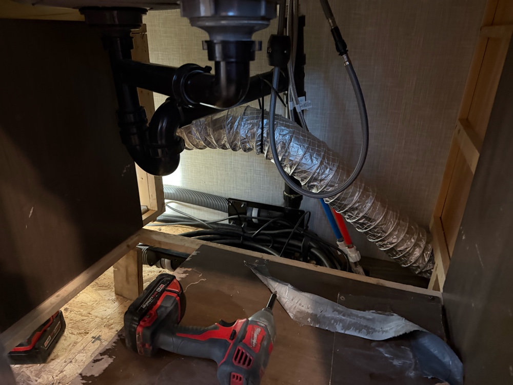 When the pipe was restored and I could turn on the tap , no leak occurred. I suspect that’s what the previous repair had been about. Phil however had me run the slide in and out and said he heard a rubbing. Sure enough the sink and counter had settled so that if we’d left it at that it likely would have broken down again down the road. Phil put in a support that ensured the slide didn’t rub against the housing for the pipe running into the grey water tank.