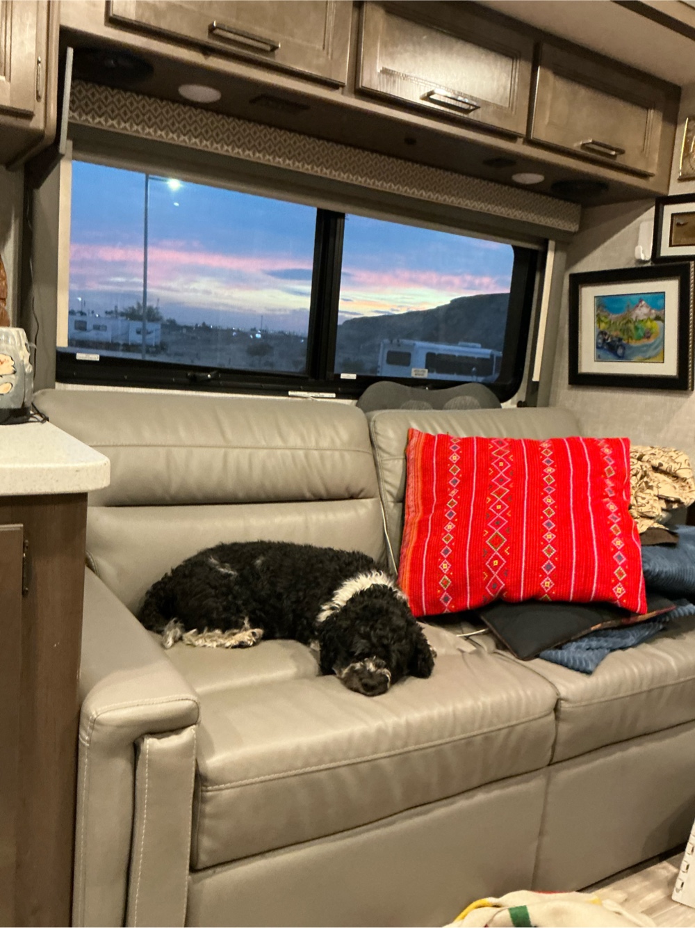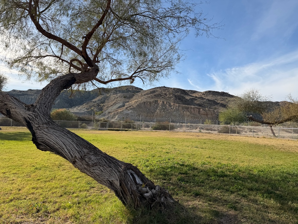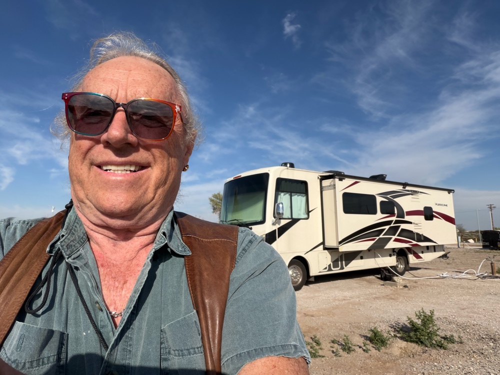 It’s been a lot of exercise walking Madigan all over Algadones. The vet hasn’t been open. On Saturday I left him in the Thor while I drove the VEspa into Yuma to the Walmart where I was able to get Siffter power mop fluid and a weeks supply of food for the fridge. I forgot bread but they must have that here at the RV mini store. I’ll go today so I can make sandwiches with the lunch meats. The Vespa ride is a challenge at 70 mph full open throttle and strong cross winds. I prefer the side road but a bridge is out so I took the free way.